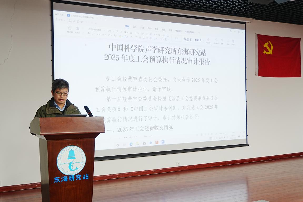 大会听取了工会主席刘晓隽作的《东海站2025年度工会工作报告》,报告全面总结了工会2025年度工作,并提出了2026年度工会工作目标。工会经审会主任吕国涛作2025年度工会预算执行情况审计报告,对工会经费收支精准“把脉”,进一步规范管理流程,保障工会工作顺利开展。财务科科长吴司怡作《东海站2025年度财务运行情况报告》,汇报了全年收支情况和“三公”经费使用情况。