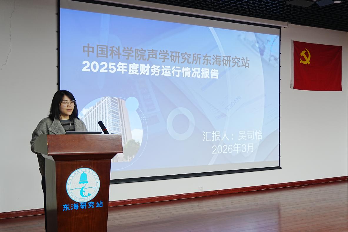 党委书记、站长许伟杰首先传达了中国科学院及声学研究所2026年度工作会议精神并作东海站2025年度工作报告。2025年,东海站以习近平新时代中国特色社会主义思想为指导,深入学习贯彻党的二十大和二十届历次全会精神,全面贯彻落实院党组、所党委决策部署,恪守国家战略科技力量主力军使命定位,紧紧围绕抢占科技制高点核心任务和“拼搏2025”工作主题,扎实开展深入贯彻中央八项规定精神学习教育,以“钉钉子”精神奋力推动研究站改革创新发展取得新成效,圆满完成“十四五”既定目标,为研究站在“十五五”时期稳步发展打下坚实基础。他强调,全站职工要以更加饱满的热情、更加务实的作风、更加有力的举措,扎实推进2026年度各项重点工作,奋力抢占声学领域科技制高点,为实现高水平科技自立自强和建设科技强国作出新的更大贡献。