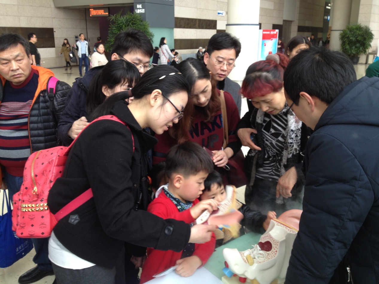 油和水两种本不相溶的液体在超声波的作用下形成了混合均匀的乳状液,参与公众 "十万个为什么"似的问题接踵而来;冷水在超声波的作用下雾气腾腾,让小朋友们尖叫不断,引得其他观众小跑着来观看;耳朵中的精细结构逐一分解,吸引了众多小朋友及家长好奇的目光,纷纷询问听觉形成原理,有的小朋友还亲自动手拼装。