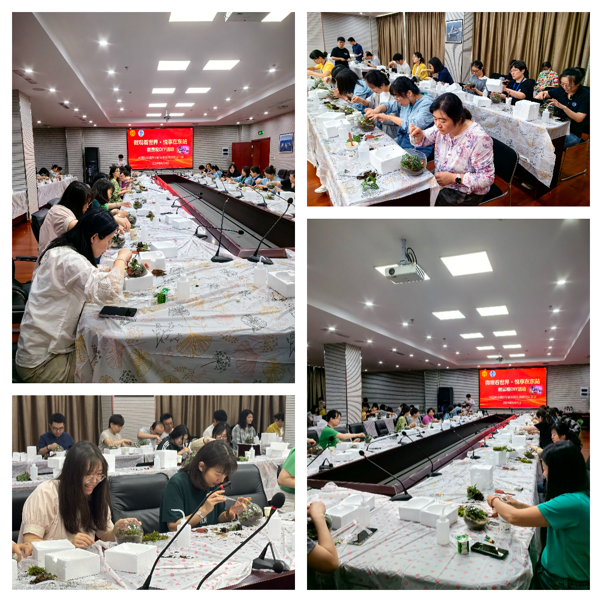 为丰富职工业余文化生活,提高职工凝聚力和向心力,通过栽培绿色植物,传递对美好生活的热爱和向往。2024年6月4日中午,东海站工会举办了“微观看世界,悦享在东站”微景观DIY活动。在嘉定工业区总工会的大力支持下,活动特邀四位微景观制作老师现场指导,全站职工、研究生共60余人参加本次活动。