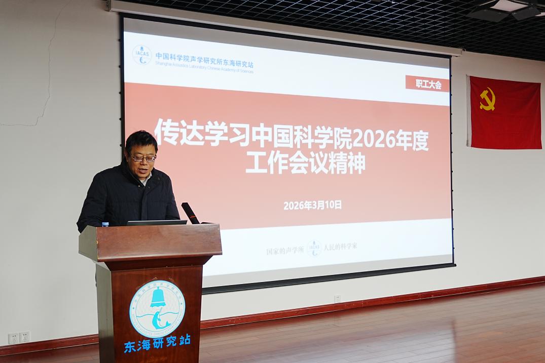 党委书记、站长许伟杰首先传达了中国科学院及声学研究所2026年度工作会议精神并作东海站2025年度工作报告。2025年,东海站以习近平新时代中国特色社会主义思想为指导,深入学习贯彻党的二十大和二十届历次全会精神,全面贯彻落实院党组、所党委决策部署,恪守国家战略科技力量主力军使命定位,紧紧围绕抢占科技制高点核心任务和“拼搏2025”工作主题,扎实开展深入贯彻中央八项规定精神学习教育,以“钉钉子”精神奋力推动研究站改革创新发展取得新成效,圆满完成“十四五”既定目标,为研究站在“十五五”时期稳步发展打下坚实基础。他强调,全站职工要以更加饱满的热情、更加务实的作风、更加有力的举措,扎实推进2026年度各项重点工作,奋力抢占声学领域科技制高点,为实现高水平科技自立自强和建设科技强国作出新的更大贡献。