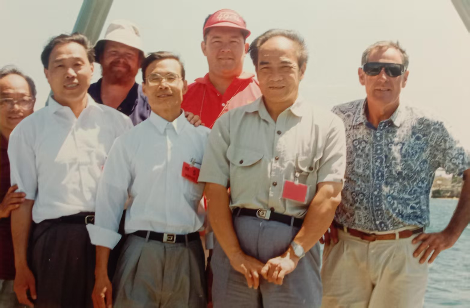 1995年2月,张叔英研究员(右2)等4名东海站科研人员与澳大利亚实验船上的船长和两位船员合影。