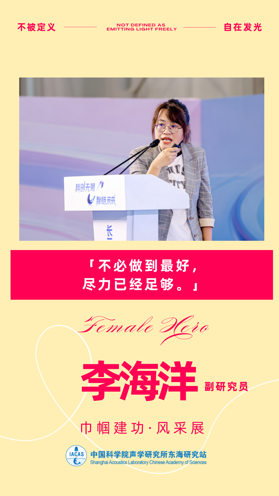 编者按:春风如你,熠熠芳华。在“三八”国际妇女节来临之际,为充分展现东海站女性科技工作者爱岗敬业、锐意进取、智慧坚韧、温柔有力的时代风采,致敬每一位心怀热爱、勇担使命、在科研岗位上默默坚守、闪闪发光的“她”,东海站妇委特别推出“巾帼建功·风采展”系列活动。本次活动共分四期,每期展示两位优秀女性科技工作者,记录她们的初心与担当,传递巾帼力量,致敬最美的她。